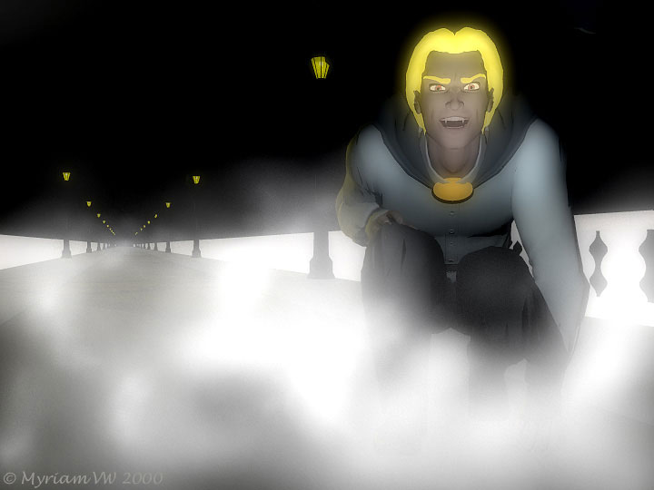 en annulant toute lumière du soleil ou de la lune, j'ai finalement réussi! Pose par moi dans Poser Déformation pour les dents de vampire de Morph World Vêtements standards de Poser sauf pour la cape (merci Luna!) Génération de l'image dans Bryce (merci à Calyxa pour son tutorial sur les yeux "brillants" et merci à Tony Waterer pour ses trucs sur l'éclairage) Lampadaire et balustrade du pont modelé par moi avec SPatch et Nendo Travail post-génération dans Painter pour la brume et dans Photoshop pour l'effet final et la signature |